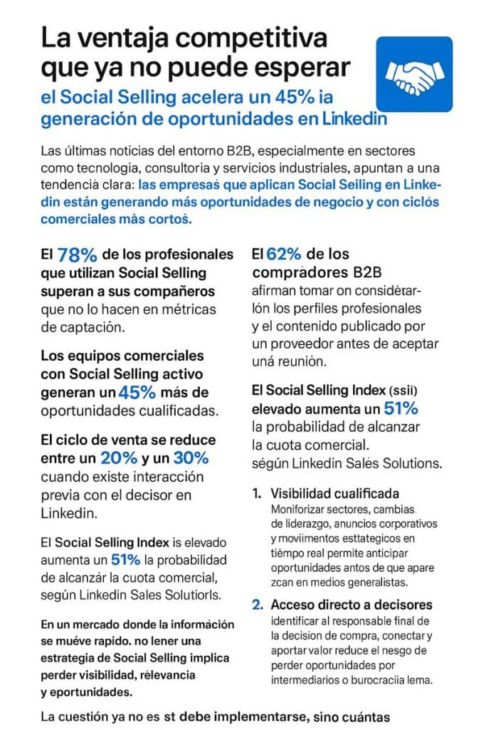 Si tu organización quiere mejorar la captación, acortar ciclos comerciales o acceder a decisores clave, el Social Selling en LinkedIn es hoy la herramienta más eficiente y medible.implementarse, sino cuántas oportunidades está dejando escapar la empresa por no activarla.